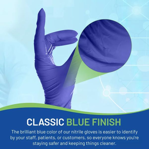 The brilliant blue color of our nitrile gloves is easier to identify by your staff, patients , or customers, so everyone knows you're staying safer and keeping things cleaner.