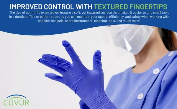 The tips of our nitrile exam gloves features a soft, yet textured surface that makes it easier to grip small tocks in a dentist office or patient room, so you can maintain your speed, efficiency, and safety when working with needles scalpels, sharp instruments, cleaning tools, and much more.