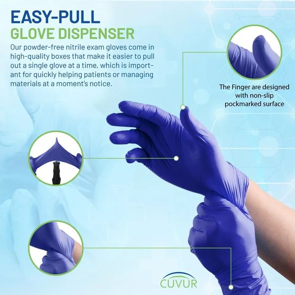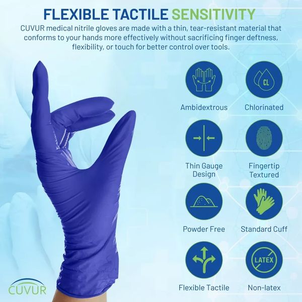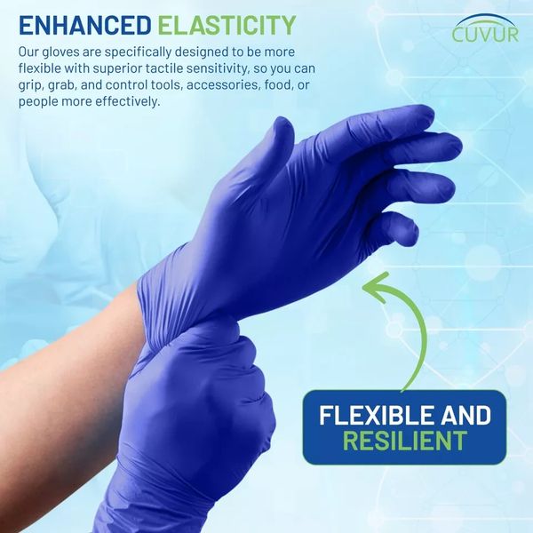 CUVUR medical nitrile gloves are made with a thin, tear-resistant material that conforms to your hands more effectively without sacrificing finger deftness, flexibility, or touch for better control over tools.